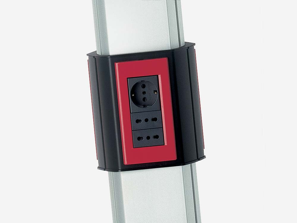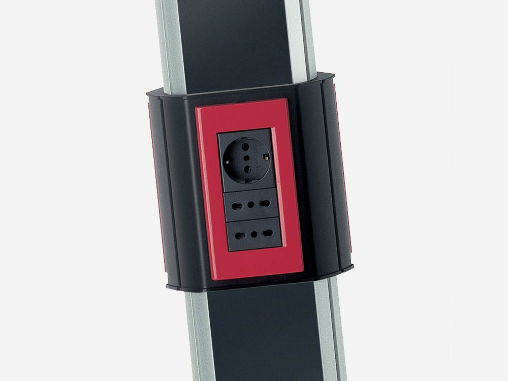 Practical and handy system, it consists of a vertical element with three compartments which is anchored firmly to the floor and to the ceiling to hold socket unit modules capable of creating configurations which are easy to modify and expand in time.